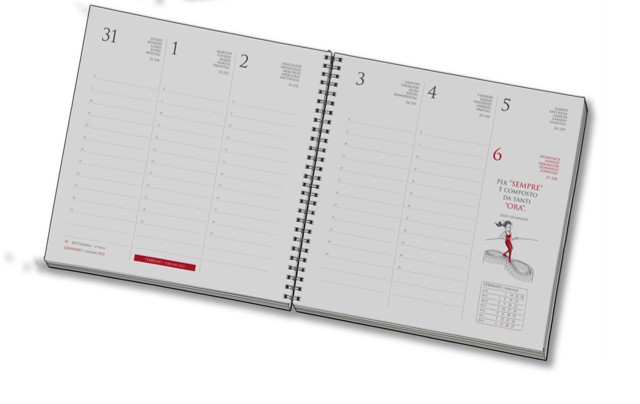 Agenda settimanale composta da 144 pagine stampate a 2 colori su carta usomano da 120 g/m². Copertina in cartoncino 400 g/m² con morbido soft touch e vernice UV. Rilegata con spirale metallica. Un aforisma illustrato per ogni settimana. Copertina disegnata dal maestro Ugo Nespolo